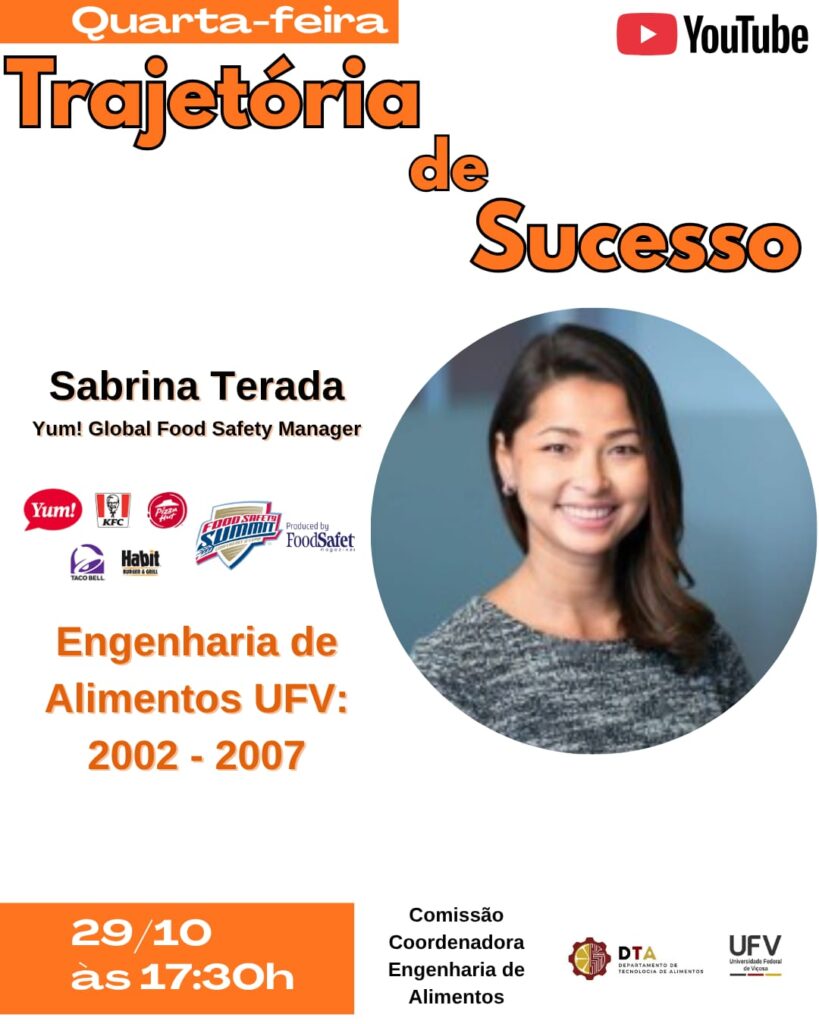 A Comissão Coordenadora do curso de Engenharia de Alimentos tem o prazer de convidar você para um encontro inspirador com Sabrina Terada, ex-aluna da UFV e exemplo de trajetória acadêmica e profissional de sucesso!